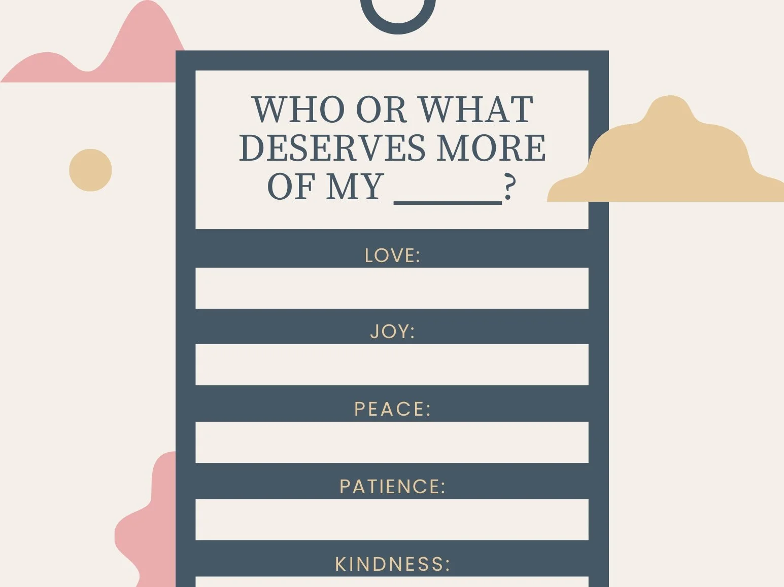 Galatians 5:22-23 describes nine attributes of a fruitful Spirit. This list is intended to help you live more by the fruit of the Spirit by identifying who or what area of your life could use more of each attribute. For example, maybe your spouse could use more of your love, your job could use more of your patience, or your neighbor could use more of your kindness. Just download, brainstorm, and fill-in-the-blank!